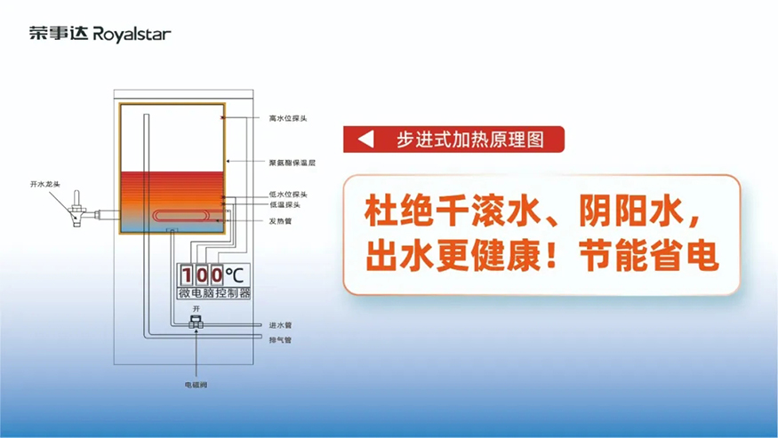 設備采用了五級過濾與RO反滲透技術,能夠有效濾除水中的泥沙、鐵銹、重金屬、余氯等有害物質,確保水質干凈、安全,出水達到直飲標準。同時,步進式加熱設計避免了“陰陽水”的產生,保證了連續供應開水的品質。