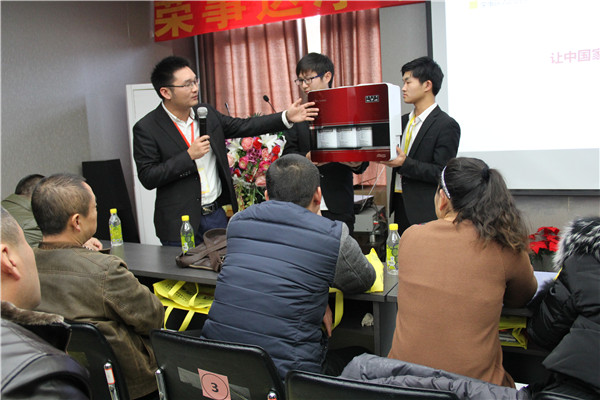 產品是終端營銷的基石,榮事達推出箱體LED純水機,渠道發展部劉總對產品進行了講解。外觀上,產品以大紅色為主色調,弧形立式設計更精致美觀上檔次。功能上,產品增壓、自吸可一步到位,有效攻克水壓不足、不穩問題;配置先進RO反滲透膜,五級過濾系統,凈化功能卓越;LED智能顯示,運行狀態一目了然等。此次會議,公司還推出高端智能凈水機,滿足消費者的不同需求。
